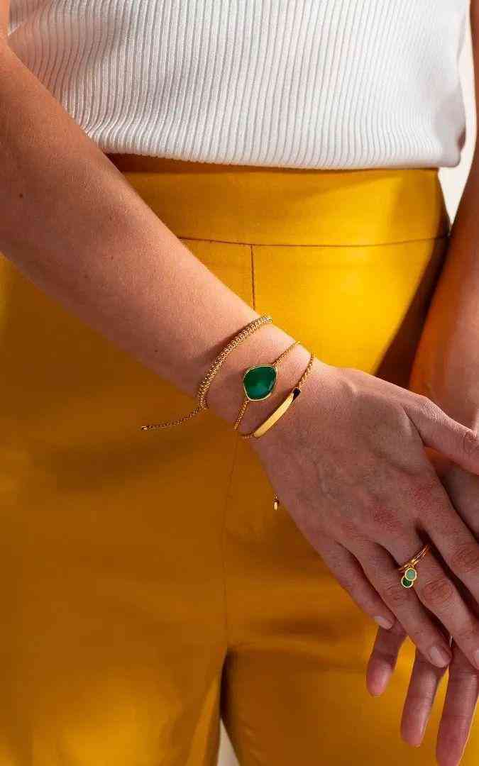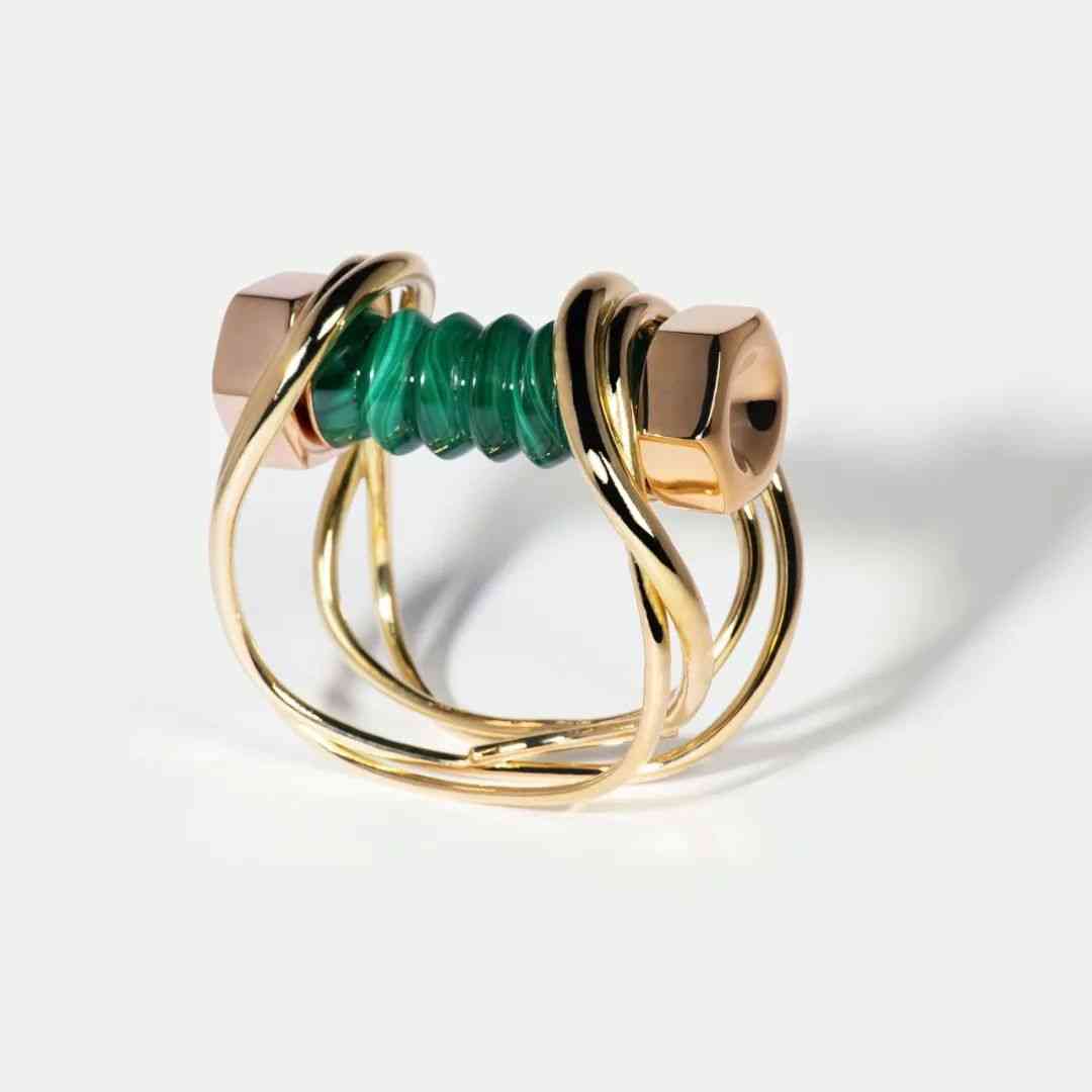 英国珠宝设计师汉娜·马丁凭借另类前卫的珠宝设计风格出圈,推出了“A New Act of Rebrllion”系列。在她的珠宝设计中,有工业风的别针穿过孔雀石戒指,也有超出比例的大号链环构成的金手链,其中的明星款是一件手镯,上面有孔雀石雕刻而成的螺栓,就像一个真正的螺栓一样,两端都有金螺母,用一根金线将螺栓连接在手腕上。