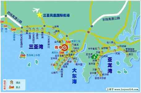 之前在网上下的这张图片,可以清楚的告诉大家三亚的海滩,已经市中心的具体位置