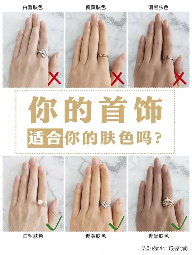 白皙肤色适合佩戴金色和玫瑰色戒指;偏黄肤色适合佩戴玫瑰金和银色戒指;偏黑肤色适合金色和银色,带有红调的玫瑰金反而会显黑。