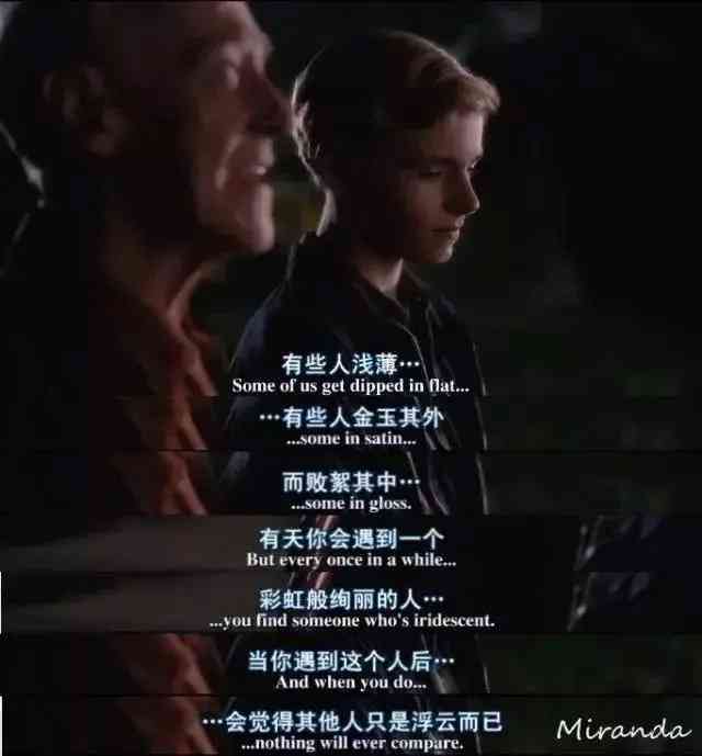 电影原句:Some of us get dipped in flat, some in satin,some in gloss. But every once in a while you find someone who's iridescent, and when you do, nothing will ever compare.