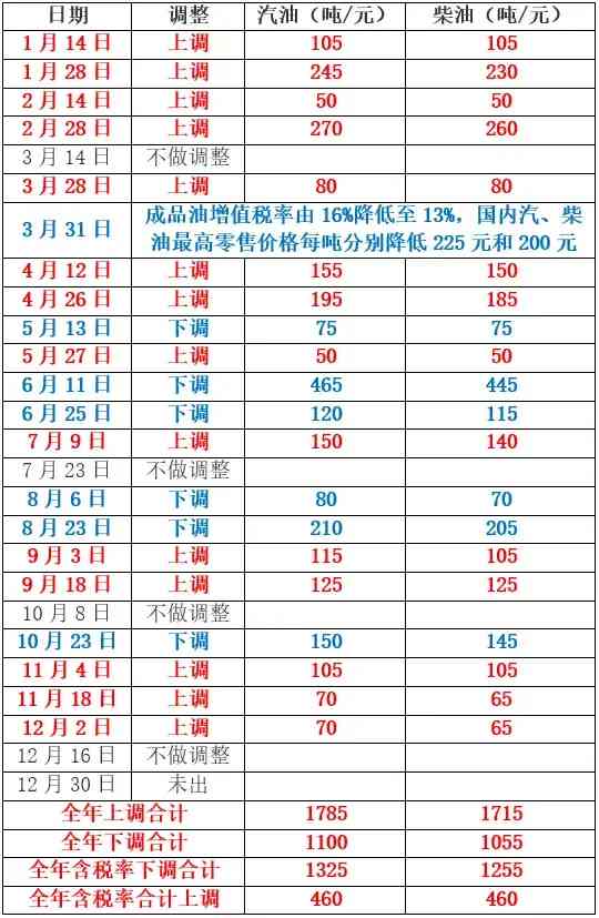根据国际市场油价变化情况,按照中国现行成品油价格形成机制,中国每14天对油价调整一次。2019年除12月30日还未到调整日期外,共计油价上调14次,汽油油价上调合计1785元/吨,柴油上调合计1715元/吨;下调6次,汽油油价下调合计1100元/吨,柴油下调合计1055元/吨;成品油增值税率由16%降低至13%,汽柴油最高零售价格每吨分别降低225元和200元;不做调整4次;最终到2019年12月16日汽柴油油价上调合计460元/吨,合计到2019年12月16日0#柴油上调 0.35元/升,92#汽油上调 0.38元/升。