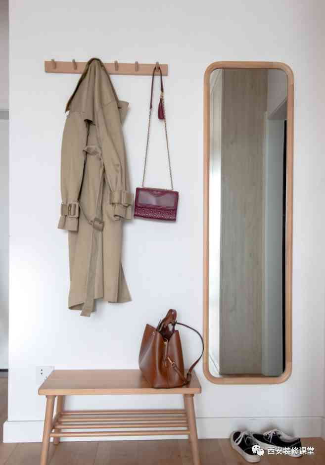 ▲户型限制门口无法实现鞋柜的基本收纳,只能采用简易换鞋凳,上下层板的形式,满足两人常穿鞋子的放置;同时全身镜与挂衣钩布局,满足进门挂包包衣服的需求;原木风的统一搭配,做到简单有个性