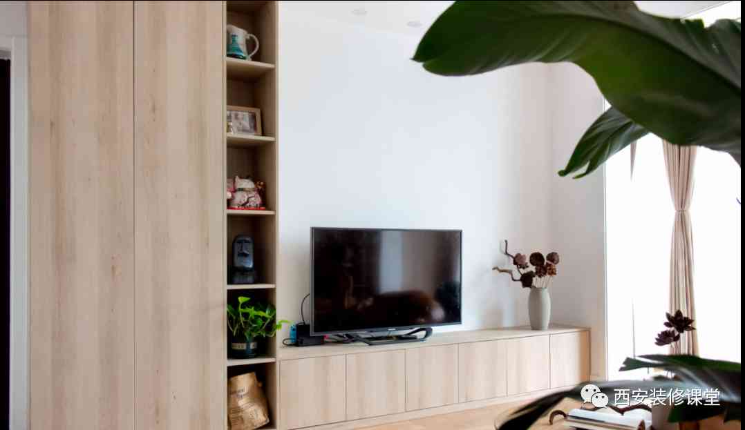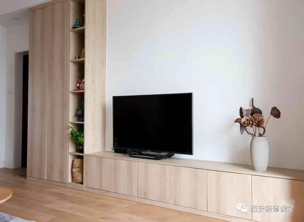 ▲进门左手就是电视墙,为了满足一定的杂物收纳,采用L性收纳定制的形式,既满足电视墙功能,同时弥补储物的不足,同样的木质的温润与大白墙的简单搭配;局部镂空做了展示使用,平时可以放一些好看的饰品,装点一下会客区域