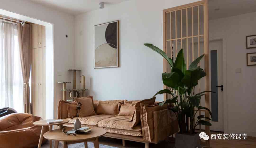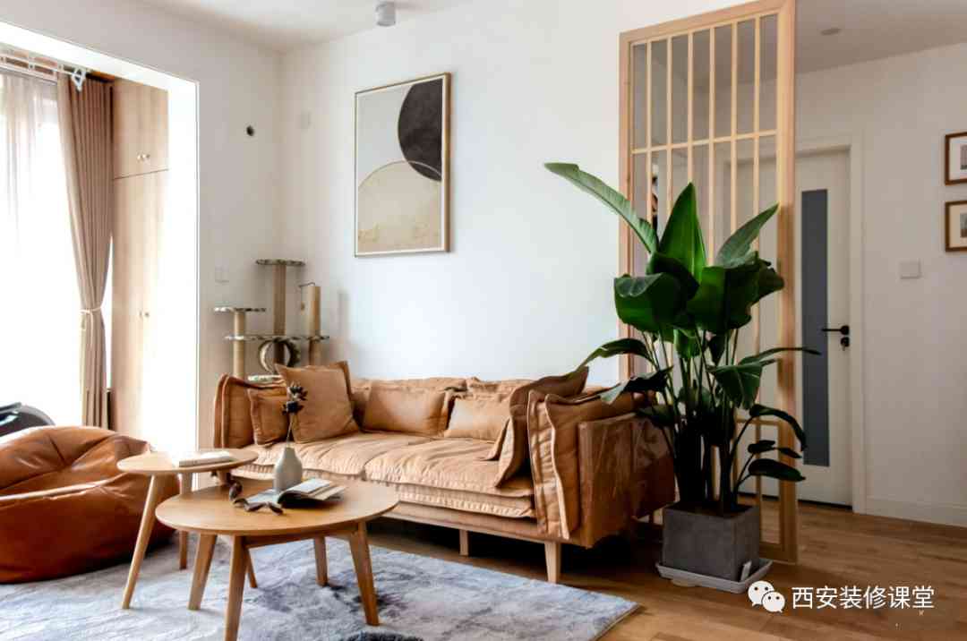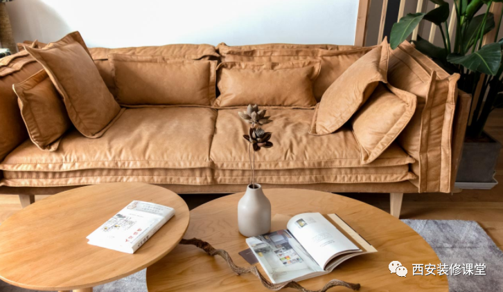 ▲棕色的科技布沙发以及懒人沙发,与木质的色调完全融合协调,双圆几的轻巧搭配让小空间更宽敞,更时尚;背景一副莫兰迪风格的挂画简单温馨
