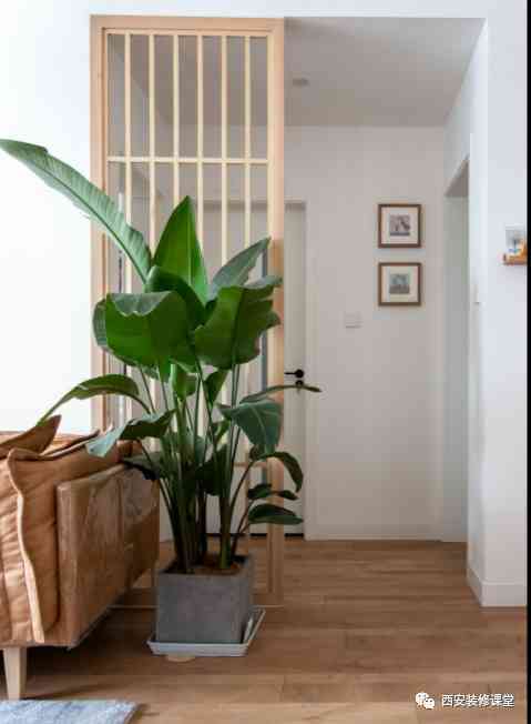 ▲打掉多余墙体,拓展进入卧室的过道,同时木质隔断让原木元素更丰富,绿植与隔断朦胧美恰到好处;背后的卫生间墙面两幅精致挂画点缀,温馨柔美