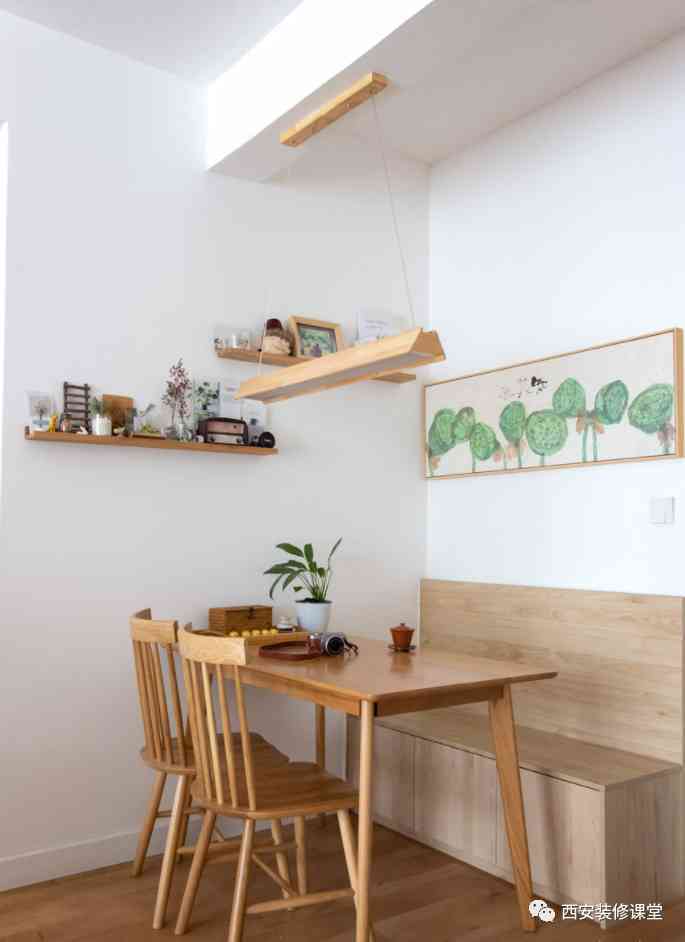 ▲进门直对的就是厨房门口,很小的空间想要满足就餐功能,刚好采用定制卡座的形式,搭配原木餐桌椅,既满足功能,同时风格更统一