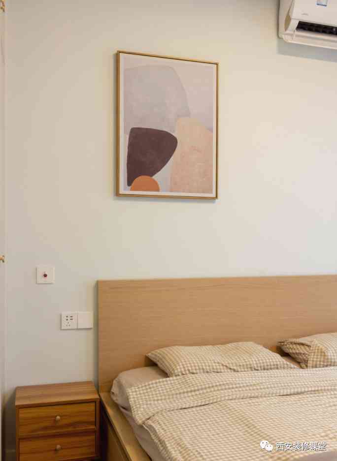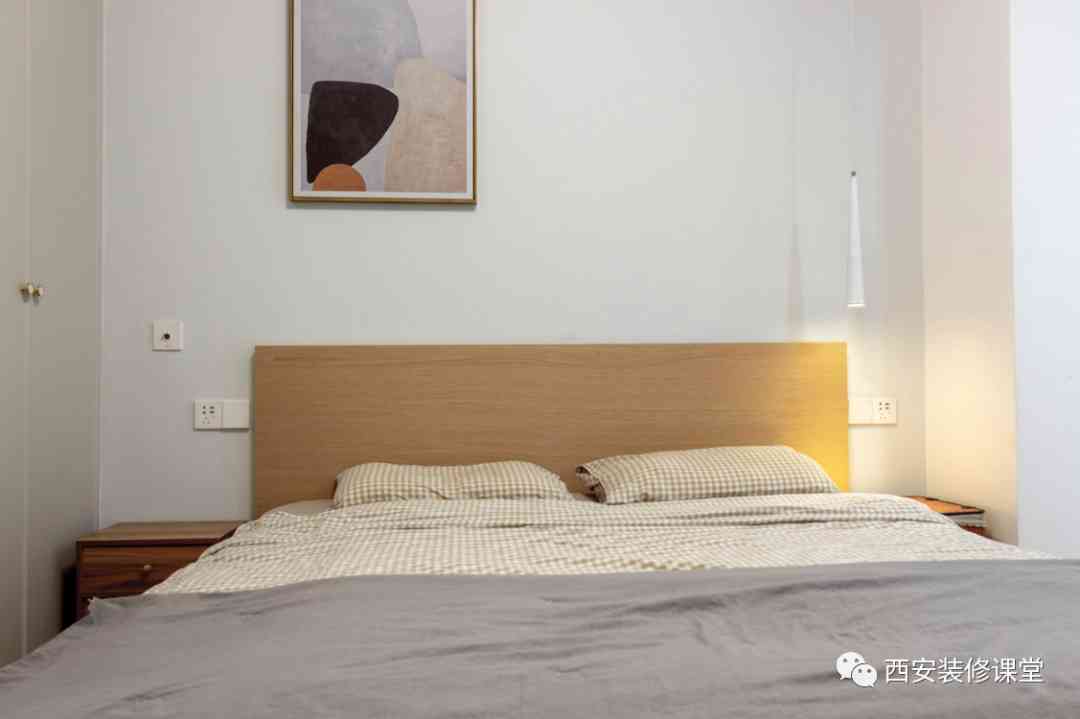 ▲主卧非常小,定制衣柜以后,刚好满足基本家具的摆放,同样是大白墙与木质的纯色对比。背景一副抽象挂画错位布局,与吊灯同时装点睡眠区的仪式感