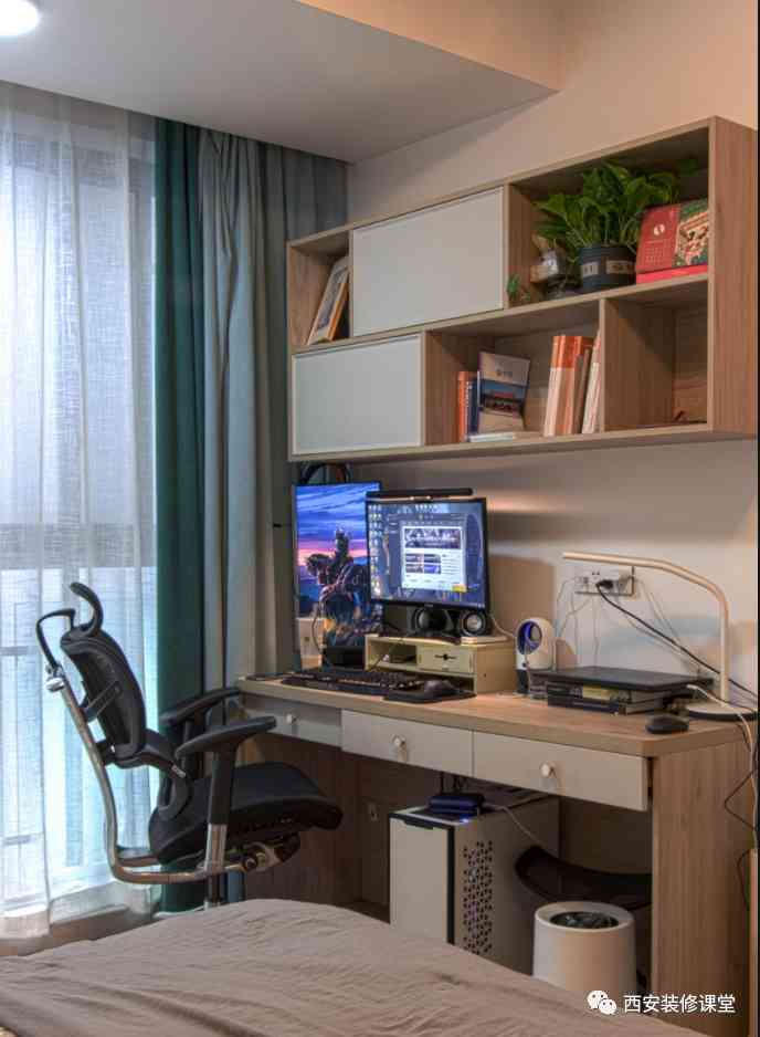 ▲主卧的床尾角落定制了书桌书柜,用来满足平时的办公需求