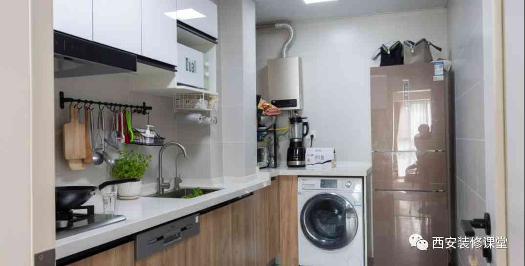 ▲原来很小的厨房,打通洗衣间以后,空间大了很多,也完美实现冰箱以及洗烘机的布局,同时很小的窗户也能引光入室
