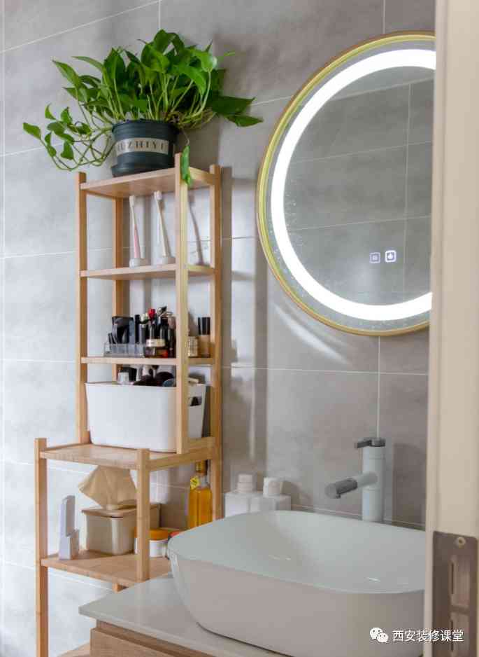 ▲卫生间空间也很小,右手浴柜空间不大,采用台上盆满足功能,搭配智能镜照明;旁边木质的置物架满足一定的收纳