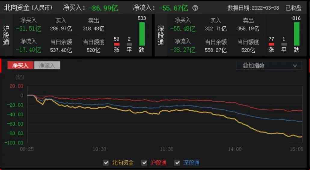 盘面上,仅东数西算、贵金属、中芯国际概念三个板块上涨,其余板块全部下跌,其中,新冠治疗板块领跌,海辰药业跌停;辅助生殖、医药商业、转基因、三胎概念等板块跌幅居前。海外局势的不稳定也让北向资金延续流出态势,北向资金净卖出86.99亿元,其中沪股通净卖出31.51亿元,深股通净卖出55.48亿元。
