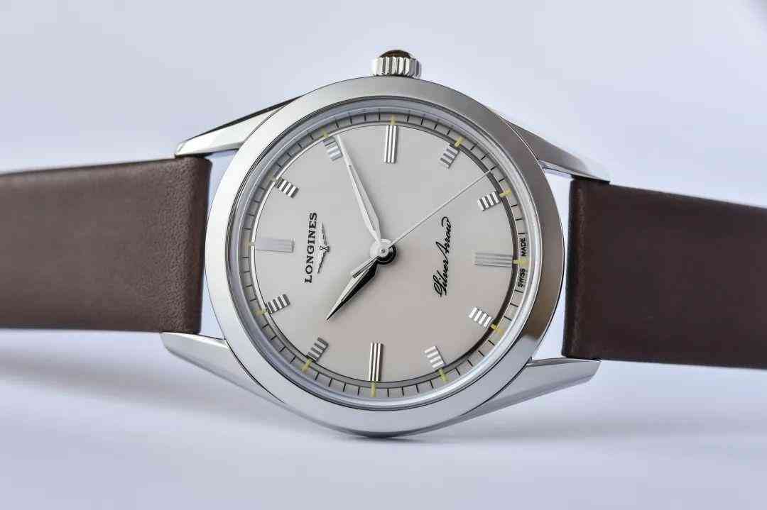 尽管浪琴10年前就已推出银箭复刻版,但2021版本才是普遍认为最忠于原版的设计。简约大三针、38.5毫米表径、整个银白色表盘除了品牌名、logo和Silver Arrow字样外,不再有任何冗余信息。Silver Arrow采用商务手写字体,在奢侈品牌纷纷将logo改成清一色非衬线字体的当下,反倒衬得清丽动人。带有凹槽的小时刻度和表背上的超音速飞船也完整参照原作,颇具其诞生时期流行的未来主义风范。
