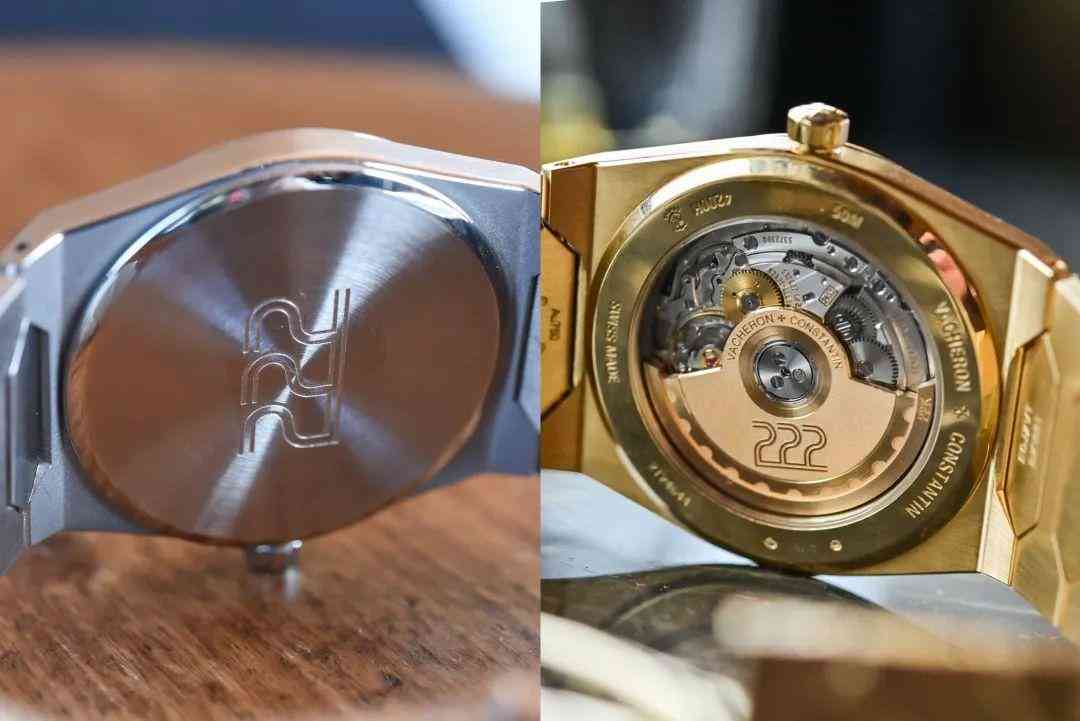 新版日历视窗位置则有细微调整,向表盘中心略微移动,不再与时标外圈相切,视窗底色也由黄变白,观感更为轻盈。表背方面,原版仅简单刻上222大名,新版则采用了精致的背透设计,不仅可以欣赏到日内瓦波纹,还有汽水瓶盖图案、拉丝和磨砂三者交替出现的摆陀。