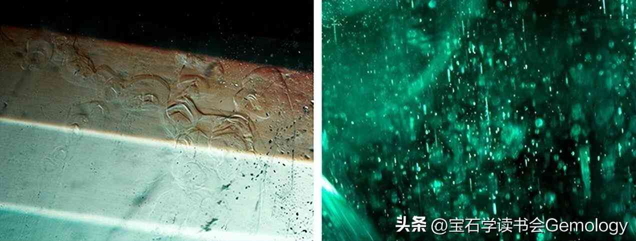 图2 2.99克拉祖母绿内部特征。左:类似油滴效应光学效果,平行于C轴方向拍摄;右:雨滴状的针状和管状包裹体