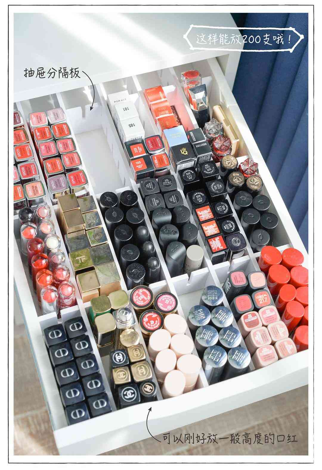 柜子层可以全部放口红,我把柜子分成了24格,每一格能放10支口红,全部放满的话,可以放两百多支。