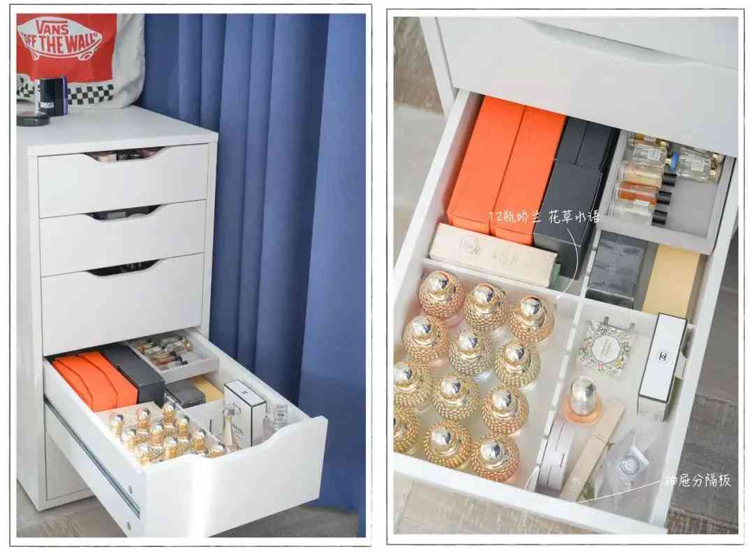 第四和第五层是香水收藏,比较重,刚好能稳住抽屉的重心,而且能避光避潮,延长香水的保质期。