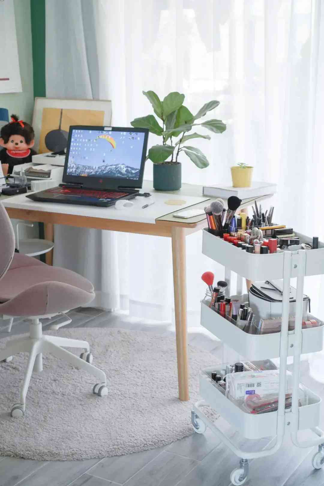 因为工作原因,粉盒每天都需要测评很多化妆品,所以一台可以移动的小推车,就很方便,随时拿取;平时化妆时还可以推到卫生间。