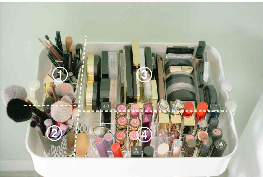 推车的层是常用的化妆品,用了4个不同的收纳盒来分区。