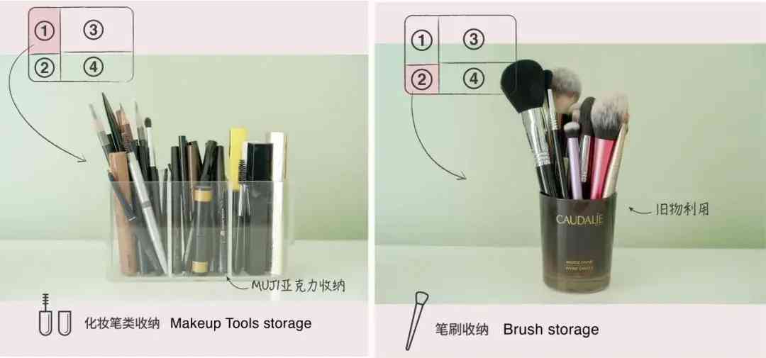 左边都是笔状产品,每一格是一种类型,可以依次是眉笔、眼线、睫毛膏。第二个桶是化妆刷,其实它是一个用完的香薰蜡烛杯,旧物利用,好看又省钱!