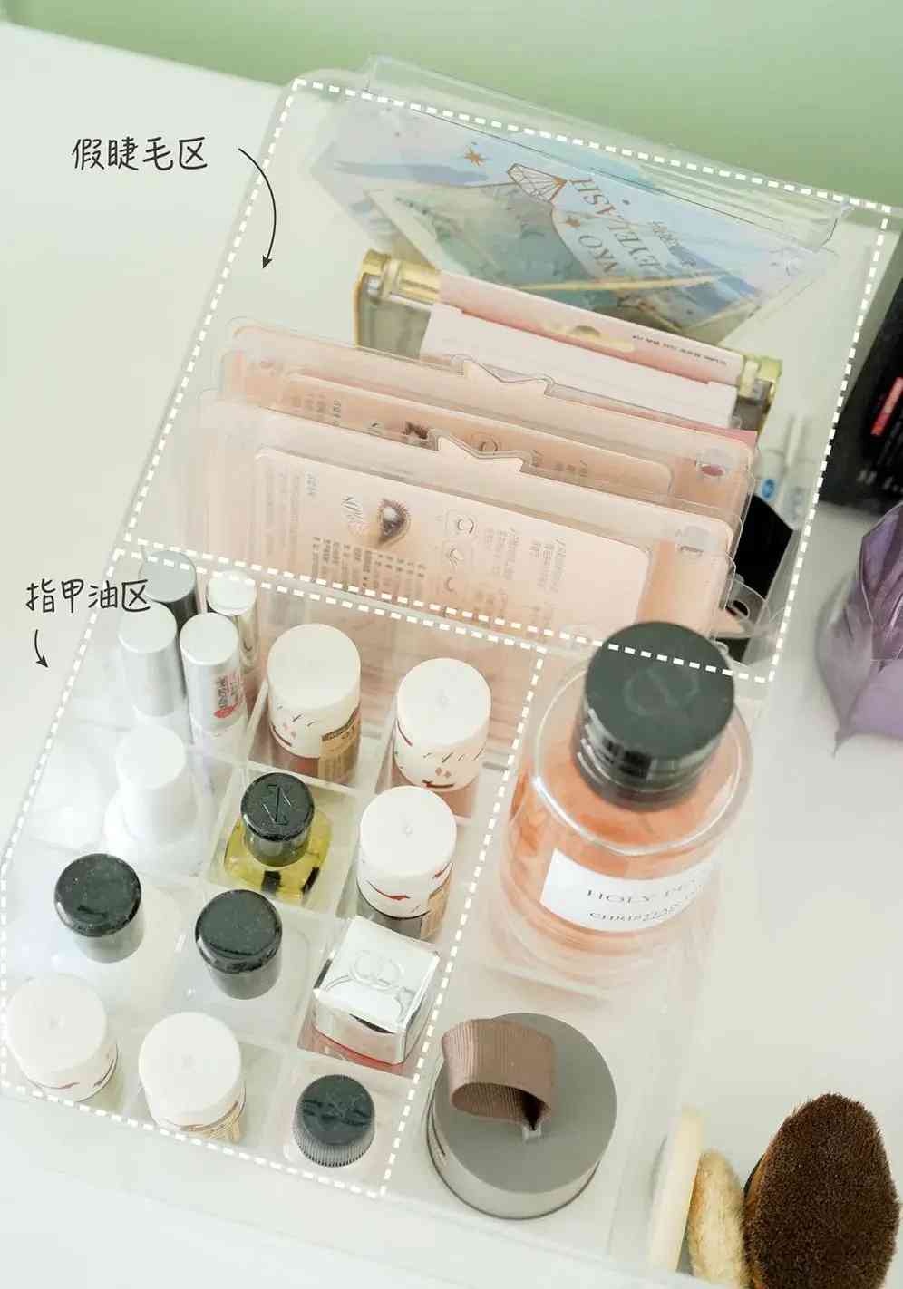 最下面一层主要用来收纳假睫毛和指甲油,也在网上找了一些尺寸合适的收纳盒来分类。