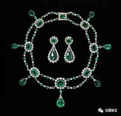约瑟芬皇后侄女巴德公爵夫人。项链及耳环,尼铎父子,1806年(1820年修改)。材质:金、银、祖母绿与钻石。伦敦维多利亚与阿尔伯特博物馆藏品。约瑟芬皇后的侄女斯蒂芬尼·德·博阿尔内(StéphaniedeBeauharnais)于1806年被拿破仑收养,后拿破仑决定将养女许配给巴德大公爵查理二世(GrandDucCharlesIIdeBade)。为庆祝婚礼,帝后二人赠给她这套雍容华美的钻石祖母绿首饰。