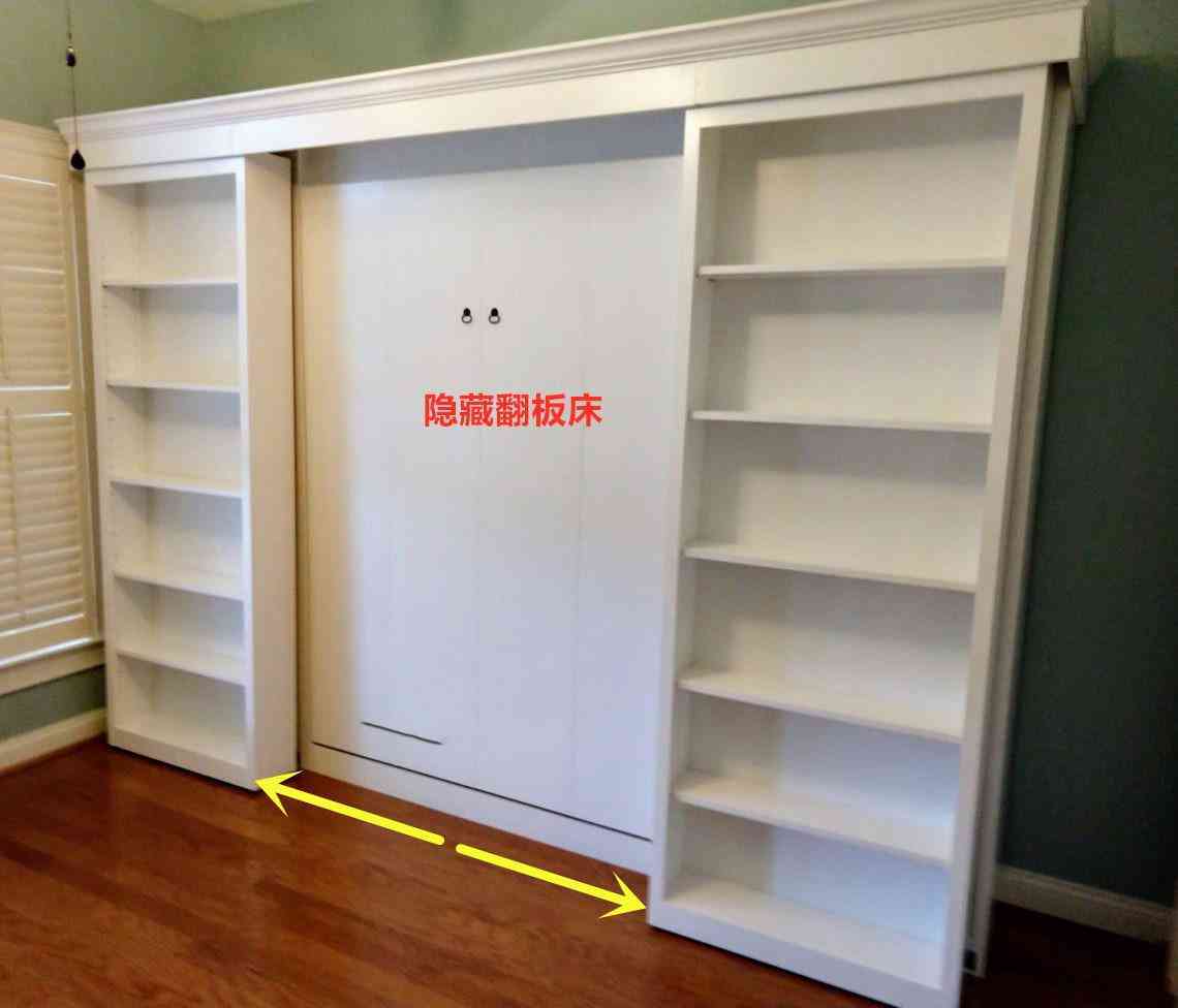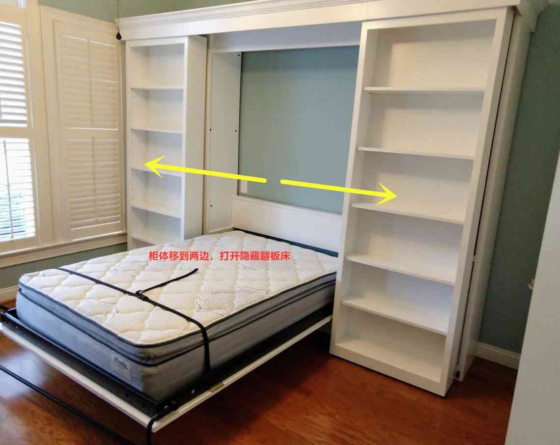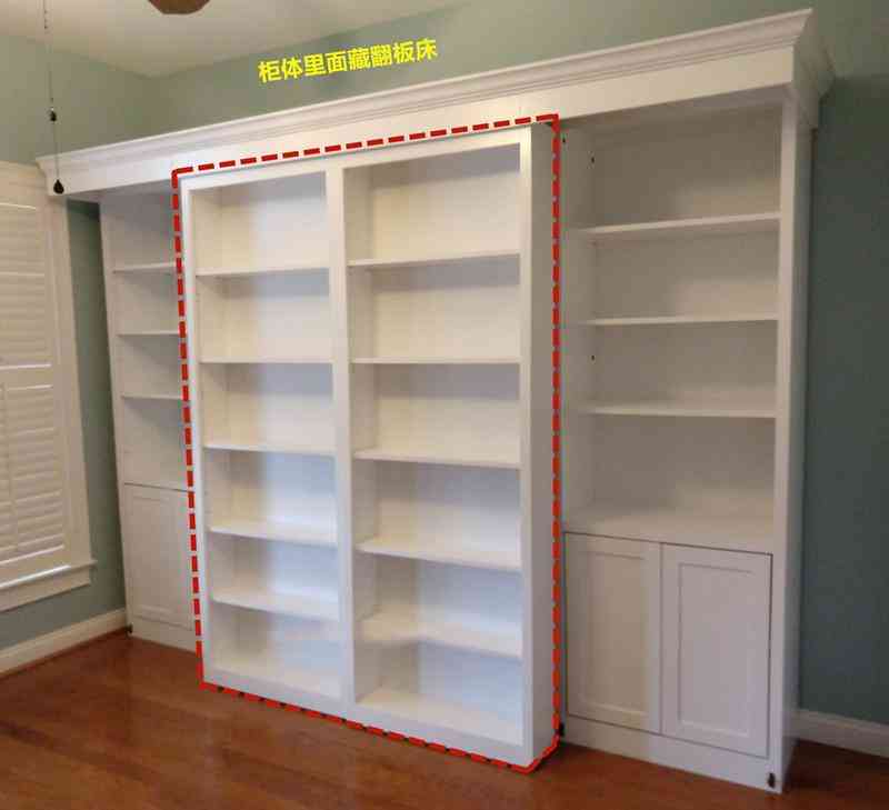 原理就是先靠墙做翻板床,然后再做收纳柜体,将翻板床完全覆盖、隐藏住,从占面积上来看,这种是常见的隐藏翻板床的2倍,更占空间一些。