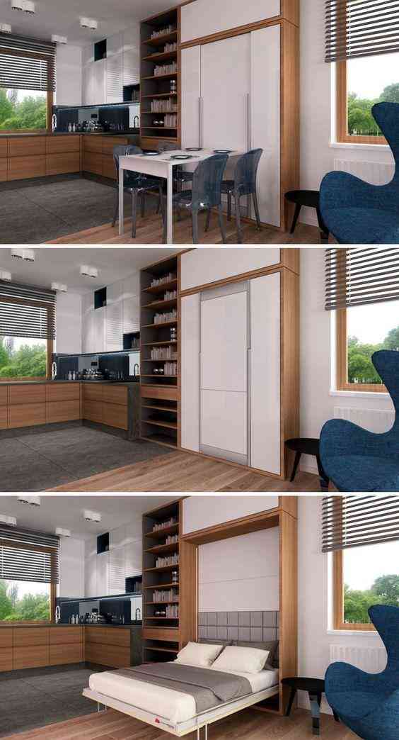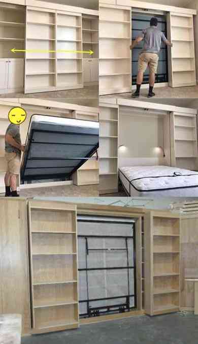 常见的翻板床都藏于柜体之中,从外表看都以为是收纳柜,其实藏着一张床,不过这种存在1个缺点,那就是牺牲柜体的收纳功能来做了床铺。