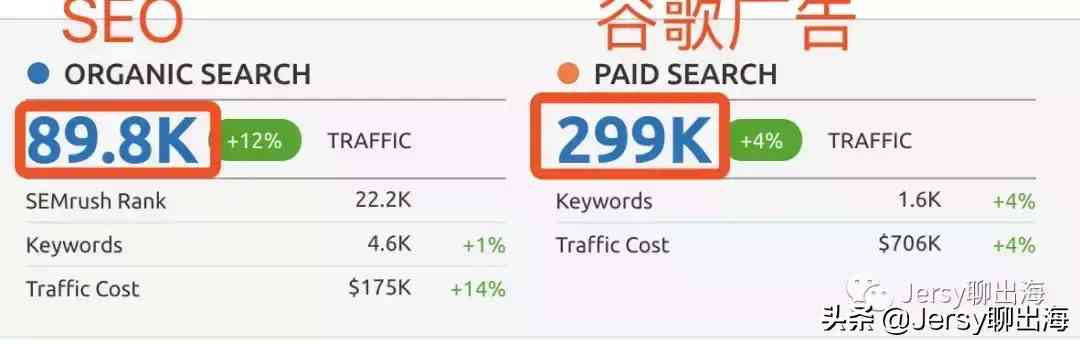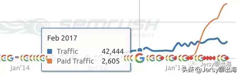 下图为Semrush这个工具检测到的的网站流量增长曲线,蓝色Traffic线代表免费流量即SEO,橙色Paid Traffic线代表付费流量及谷歌广告。