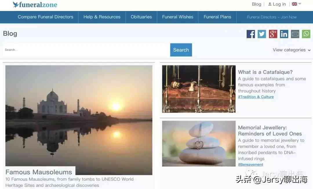 尝试搜索【Funeral Blog】可以搜索到一堆关于葬礼的博客(funeralzone.co.uk/blog,usurnsonline.com/,idodeath.com/)点击个来看看。