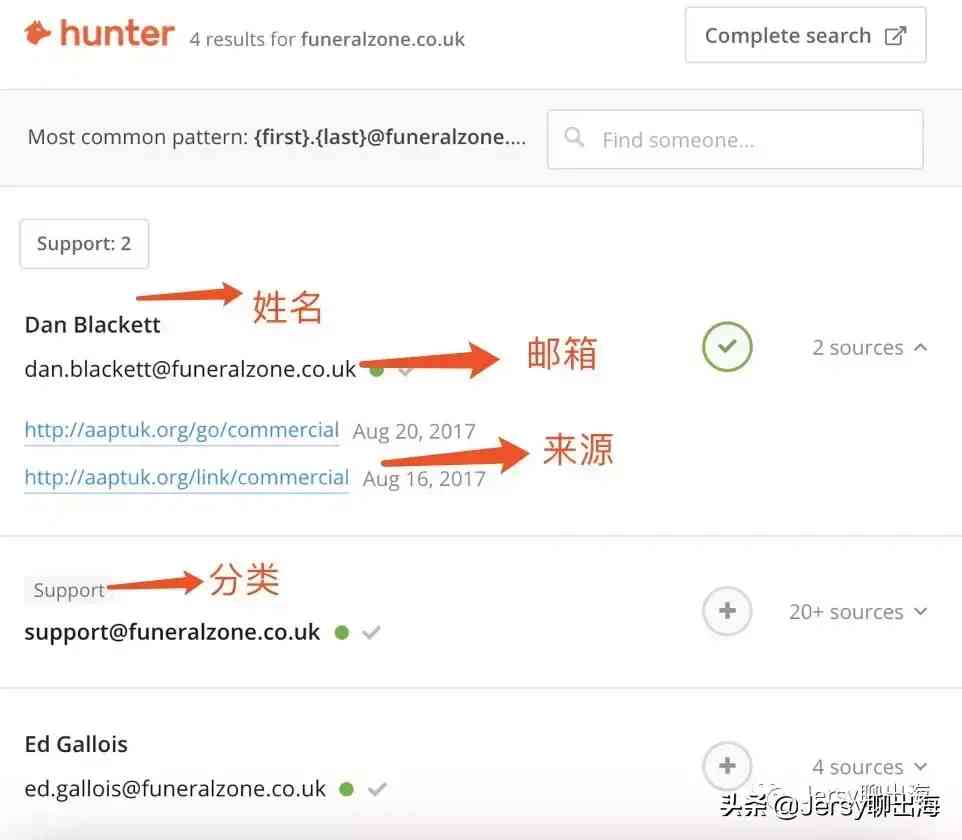 这里我们打开Hunter这个插件,他可以帮助我们自动抓取 stardust-memorials.com 上的联系人邮箱并分类,可以看到hunter甚至将邮箱主人的姓名,来源,部门分类等信息都帮我爬取了。