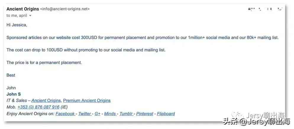 反观ancient-origins.net这种大型网站,因为流量大业务广,很多人都想去他们网站推广,所以他们是很强势的,爱来就来不来就滚。优点是明码标价,缺点就是缺乏议价空间,说什么就是什么。