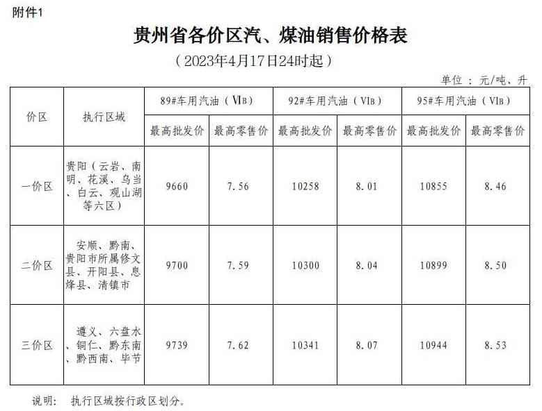 根据国家成品油价格形成机制,国家发展改革委决定自2023年4月17日24时起上调国内成品油价格。按照国家调整要求和相关规定,贵州省89#汽油(国VIA)、0#柴油价格每吨在现行标准基础上分别提高550元和525元,具体价格可由各经营企业在不超过最高批发、零售价格的前提下确定。调整后各油品最高价格见附件。