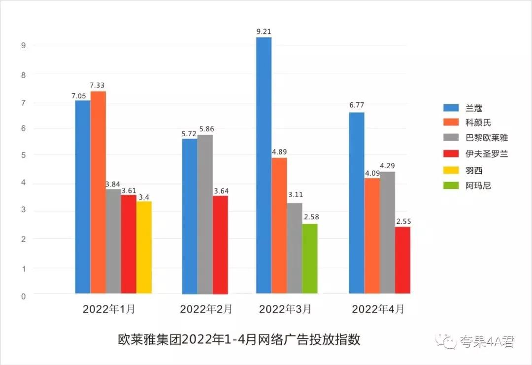艾瑞数据显示,欧莱雅2022网络广告投放指数高于雅诗兰黛,1月和4月份最高,其中移动端投放大于PC端,主推品牌兰蔻、科颜氏、巴黎欧莱雅、伊夫圣罗兰、阿玛尼、羽西。如下图: