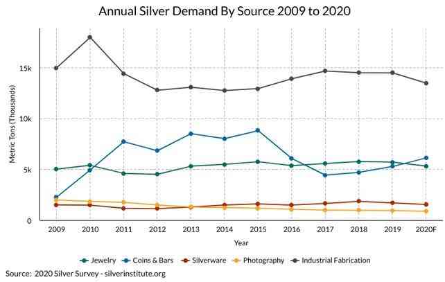 虽然白银仍然具有作为价值储存手段的特性,但它具有的其他特性也创造了对这种金属的工业需求。因此,每年都有一部分白银没有被制成银条存放在金库中,而是被用于制造电子产品、电池,以及其他工业用途。
