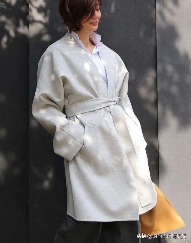 富冈佳子穿搭长款的外套,会在已有的上长下短的基础之上,借用一条腰带,划分出非常明显的抬升腰线,如此,便有了非常明确的身形比例。