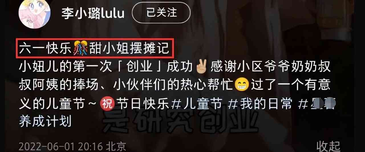 李小璐还曾在社交平台上分享了一则日常带娃的vlog,李小璐带着甜馨在小区的路边卖东西,并说这是“小妞儿的次‘创业’成功”,带着她过了一个非常有意义的儿童节。