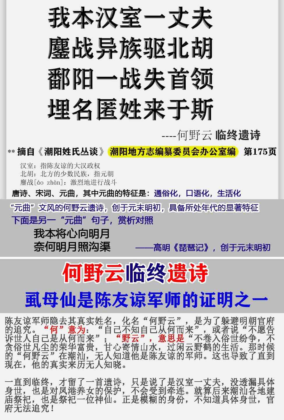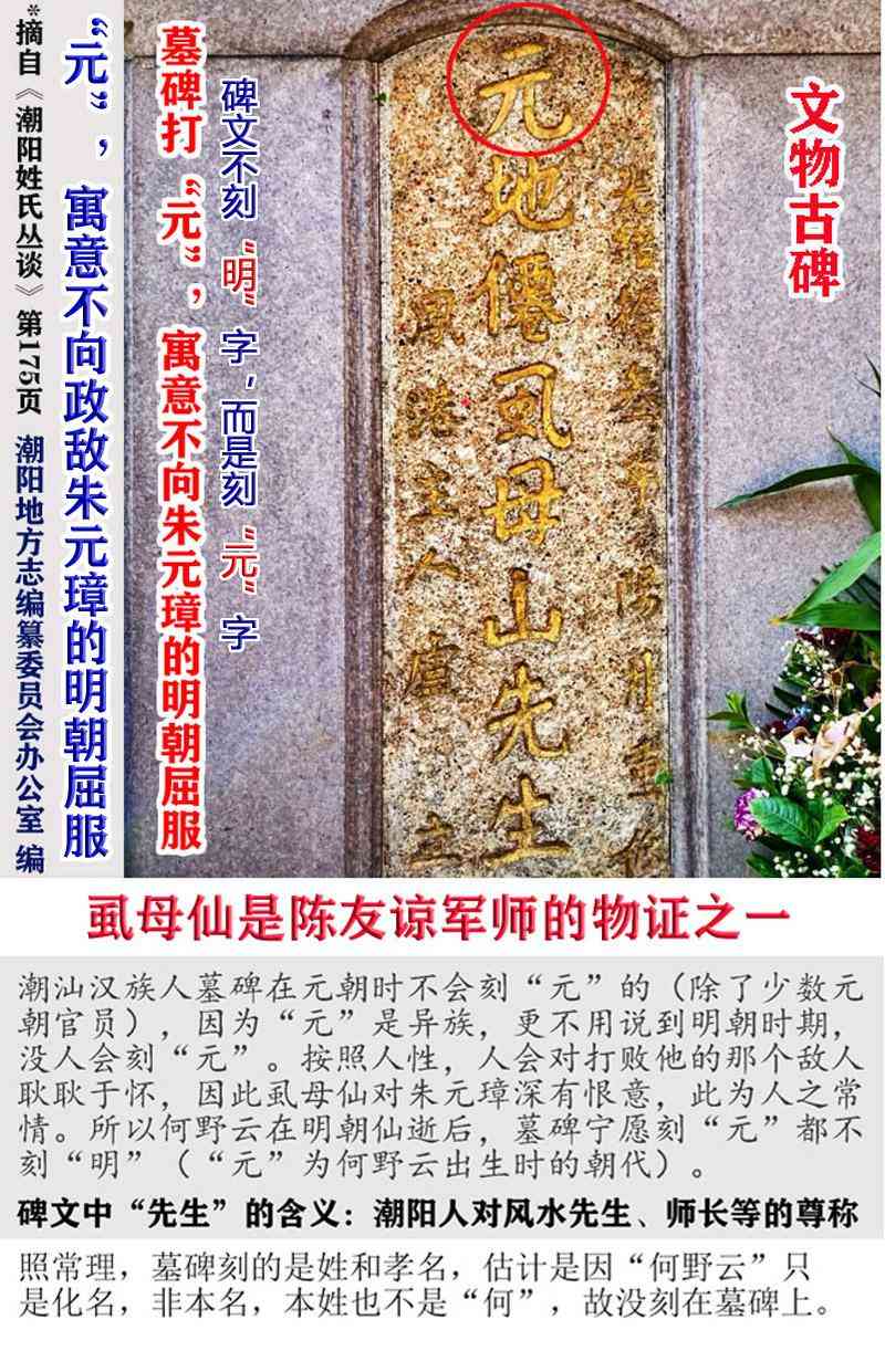“虱母仙”何野云是陈友谅军师,得到史书官方志《潮阳县志》、《潮阳姓氏丛谈》、《潮阳市志》,和《凤港卢氏族谱》、港头《张氏族谱》等,还有自古以来无数的民间传言,并且何僊陵重修碑记也是如此记载。而且何野云早期到潮阳的时间明朝洪武元年,在五皈寺和华古岩都有记载。