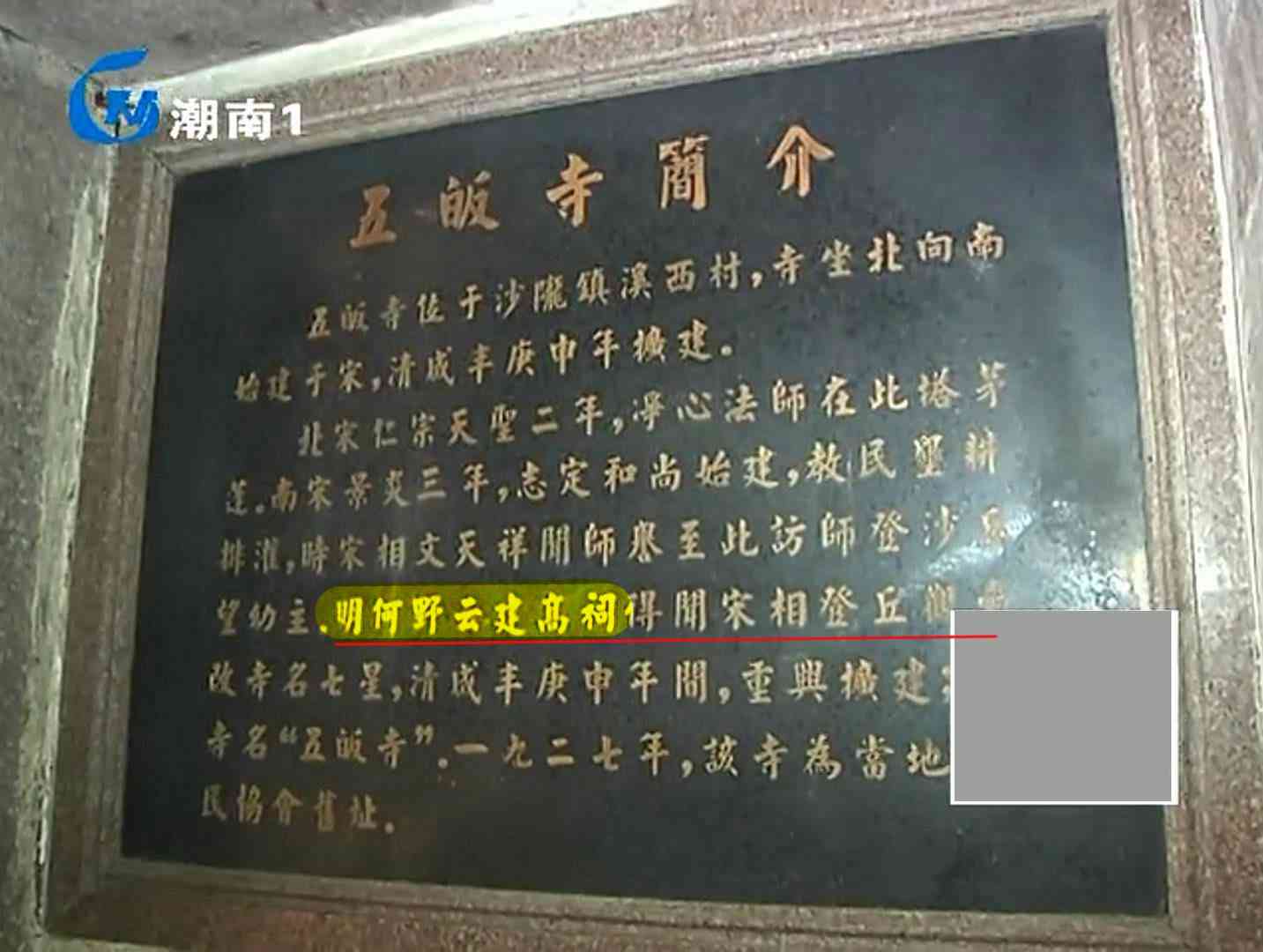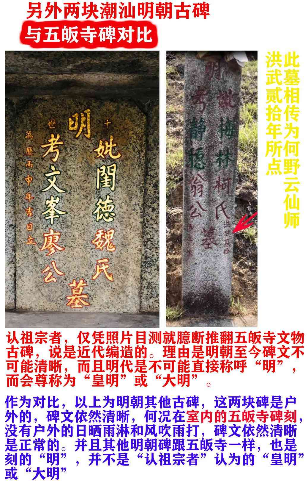 明 洪武一年何野云在“五皈寺”附近为高氏建祠堂,步至寺游玩,“ 五皈寺”碑刻(文物保护单位)证明洪武一年(1368年)何野云已经在潮汕,此时何野云43岁,正值中年。而认祖宗的人,此时14岁。