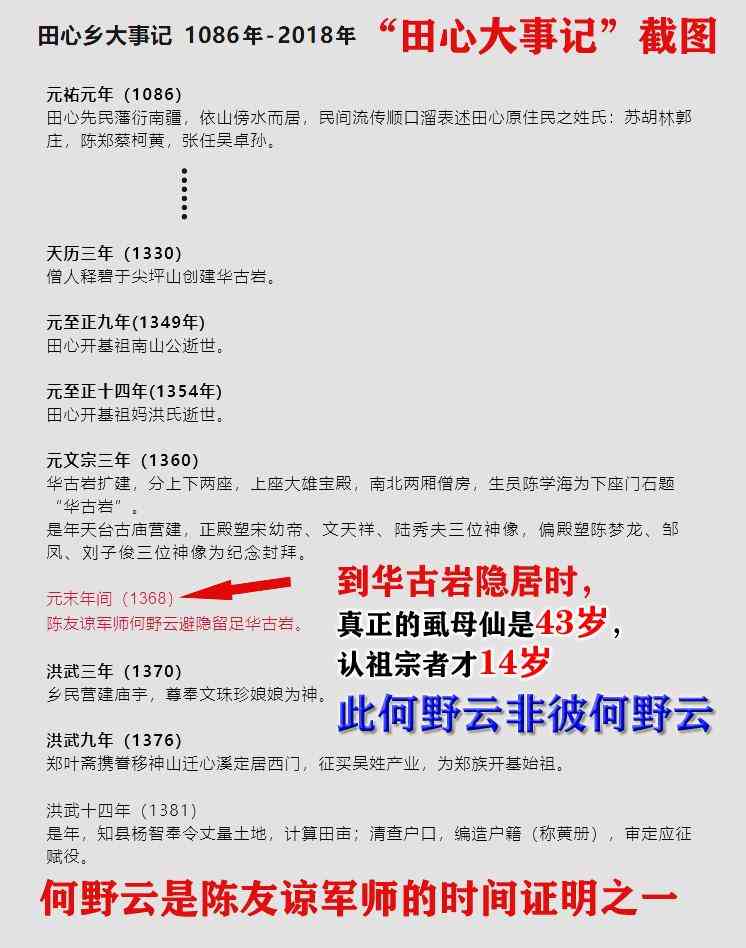 众所周知,虱母仙没有子嗣,只有一养女,即凤港四世祖嫲赵氏,养女给养父养老,并送终造墓,这是符合人之常情的。虱母仙的养女赵氏生于1347年,养女比虱母仙小22岁。这符合人之常理。但是认祖宗者却比养女赵氏还小7岁,这不合常理,养父不可能比养女小。这说明:虱母仙与认祖宗者是不同的两个人,此何野云非彼何野云。