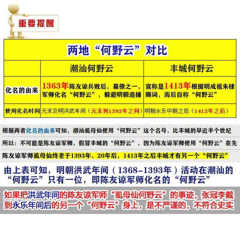 众所周知,1363年,陈友谅兵败后,其幕僚之一,军师为了躲避明朝朱元璋的追捕,化名“何野云”流落潮汕,陈友谅军师使用何野云这个化名的时间,是元末到1393年之间。而江西丰城,据说也有一个“何野云”,他们宣称其是1413年根据明成祖朱棣赐词,而后称“何野云”,他们使用“何野云”这个名字,是1413年之后。