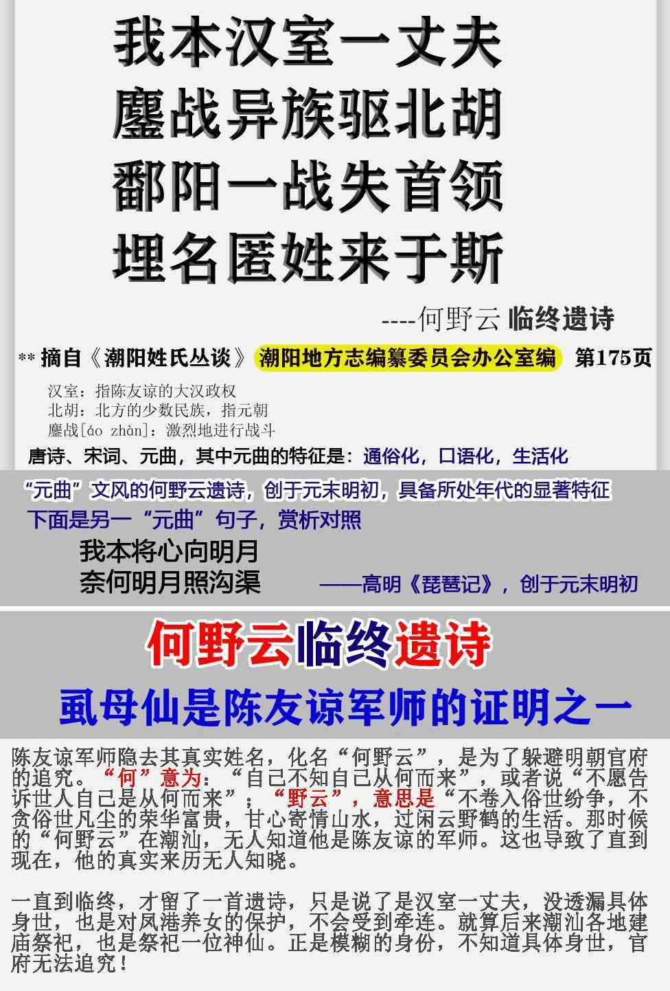 潮汕人信仰的虱母仙是明朝洪武年间陈友谅军师化名的何野云,而不是信仰其他时代的同名同姓的其他“何野云”。