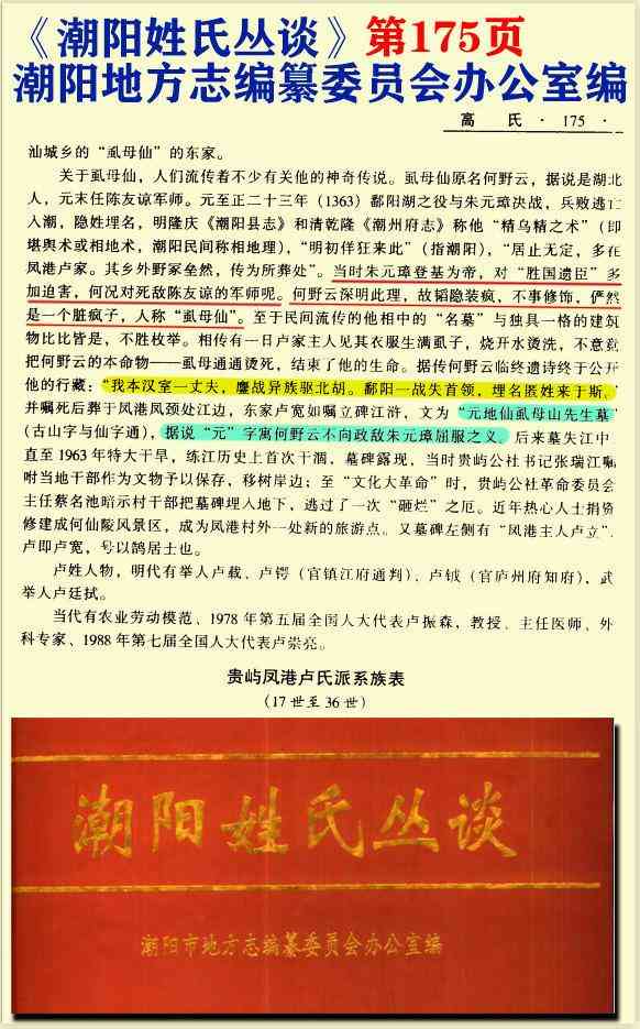 从四世祖嫲和祖公的生卒年的记载,还有葬地的记载,可以看出《凤港卢氏族谱》是实事求是的记载的。所以对于何野云的记载,也必然是实事求是的。