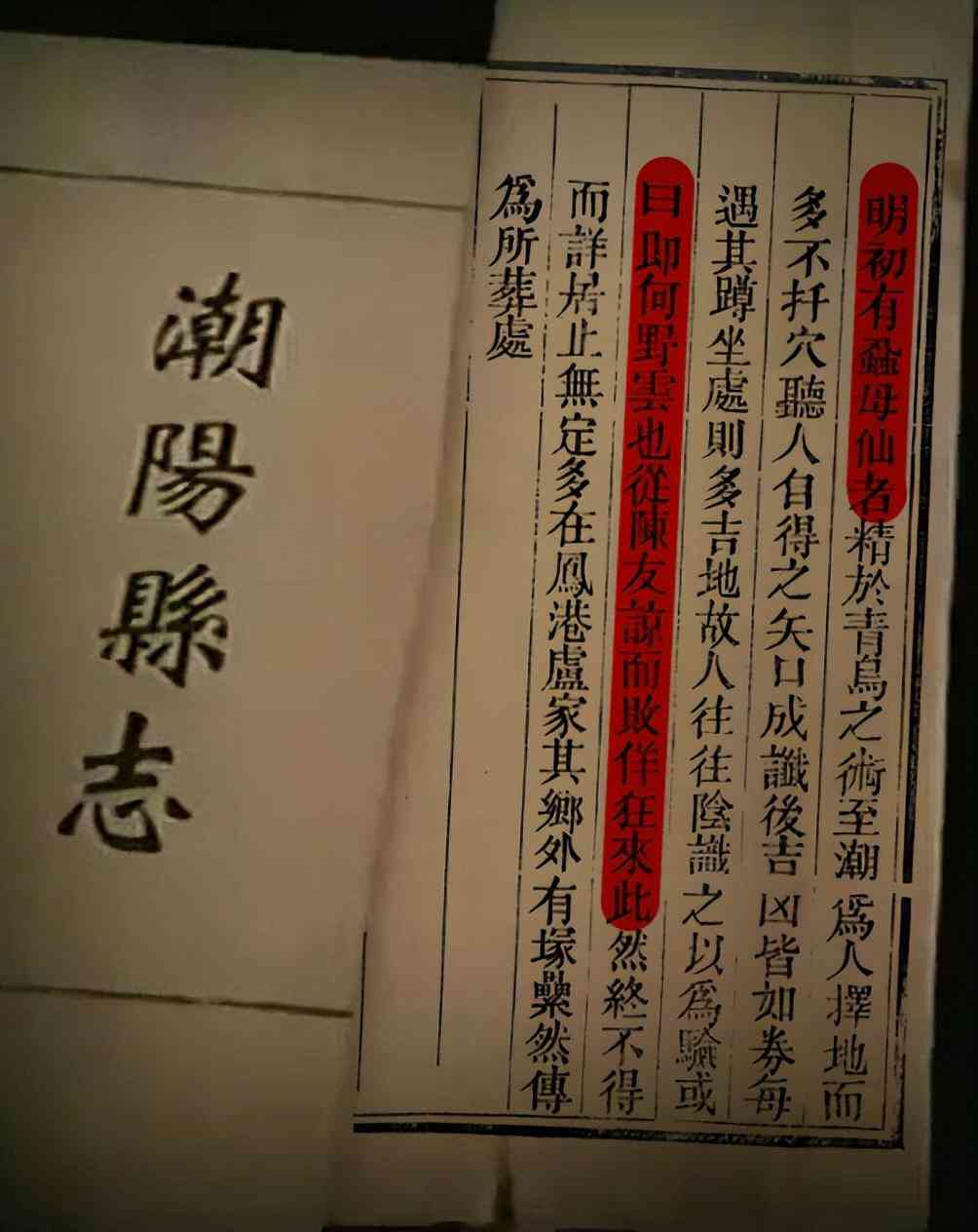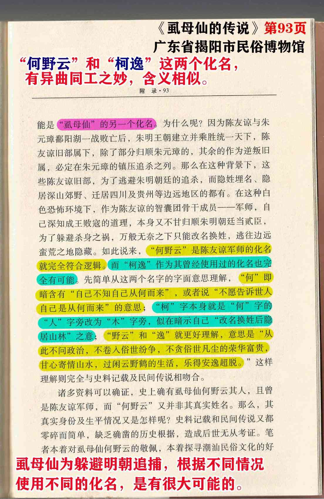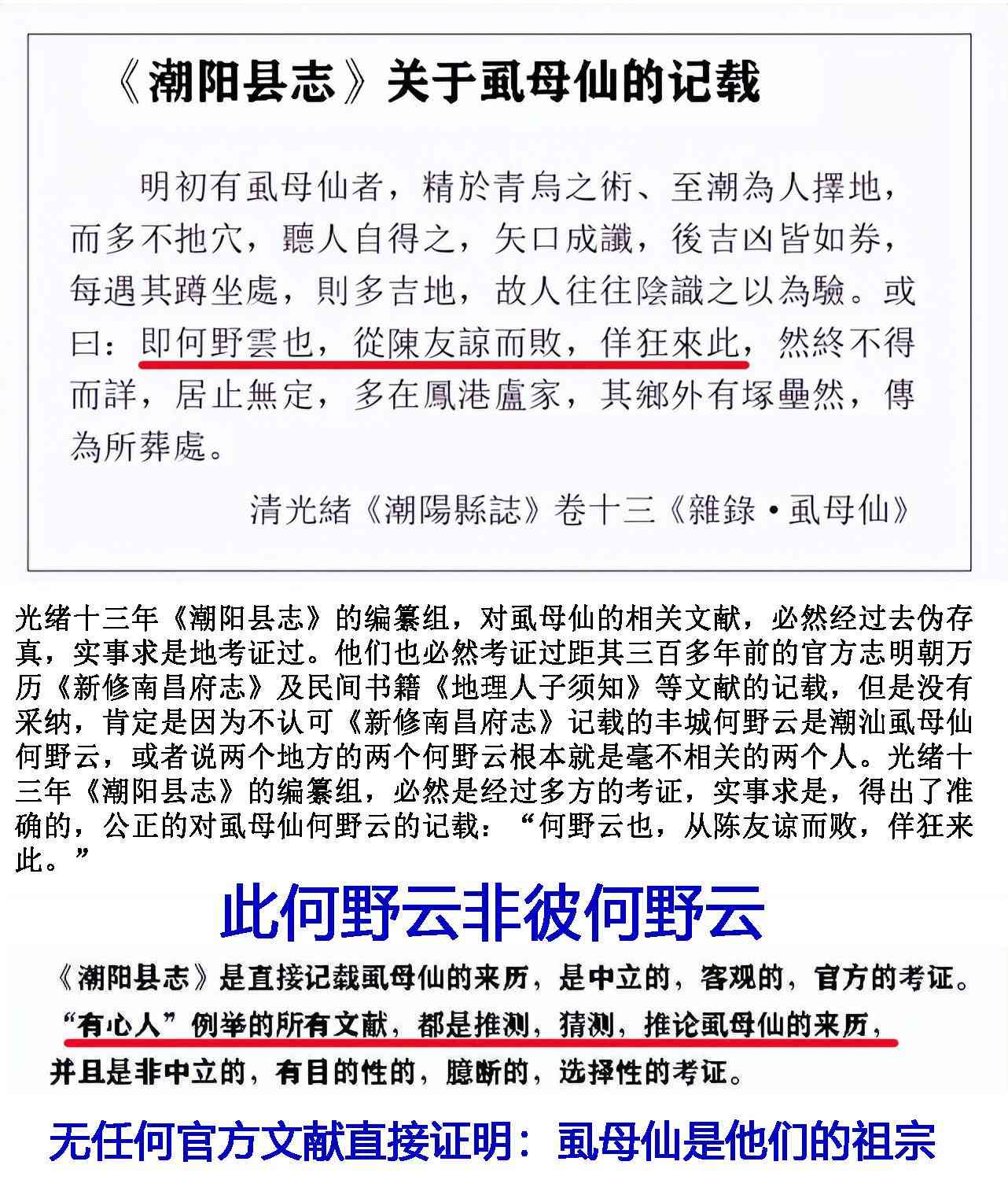 还有他们例举了清乾隆《南昌府志》记载:“明,何冶云,号半溪,丰城人,与南昌刘孟逅子南、新建赵子方同精形冢术”,这里同样,没有记载潮汕虱母仙何野云是丰城何野云,只是记载明朝有个“何冶云”是丰城人。他们认为“何冶云”跟“何野云”同音,应该是“野”被错写成“冶”字了。“何冶云和“何野云””到底是不是同一个人,我们不得而知。