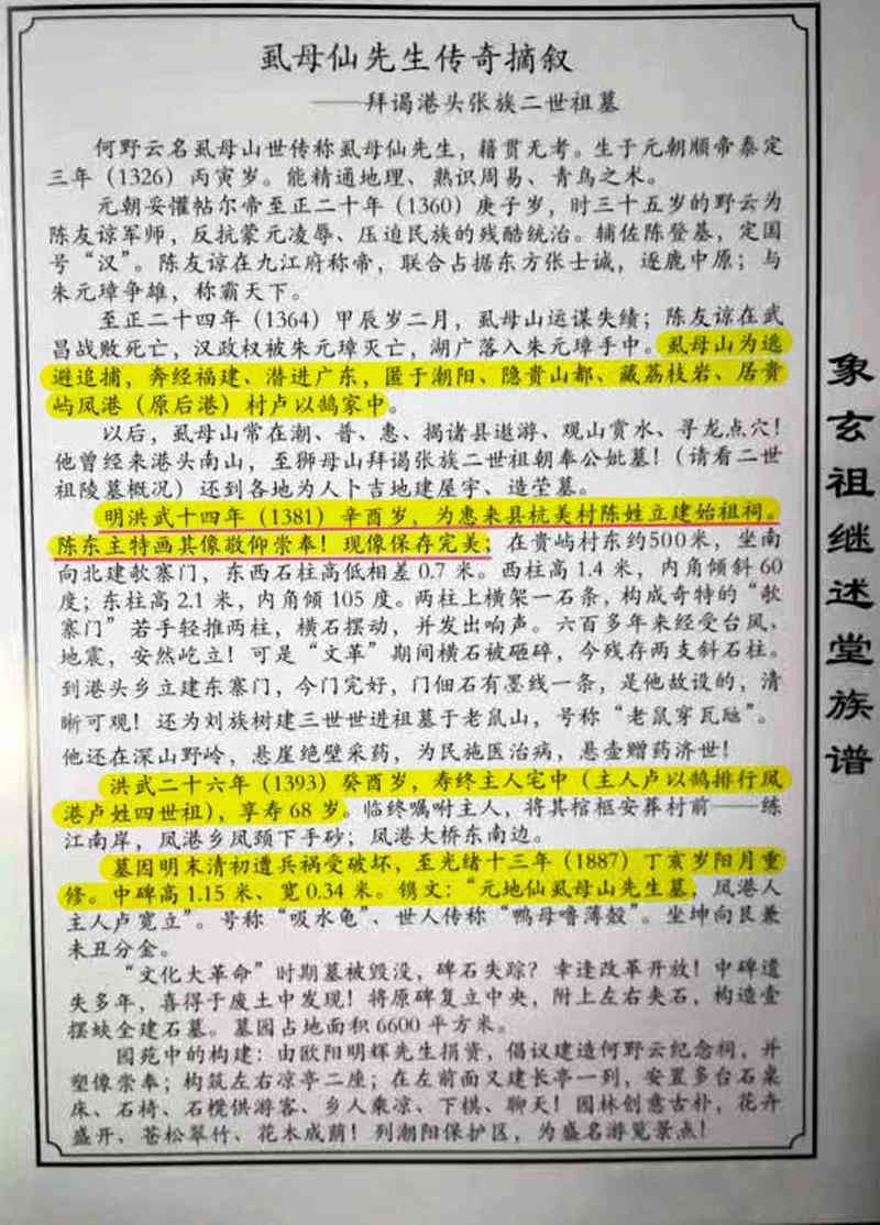 从上面的分析已知晓,洪武年间(1368-1393年)的何野云各种事迹,实际就是陈友谅军师化名的“何野云”的活动事迹。除了官方的文献有何野云在潮活动的记载,非官方的,如胪岗镇港头《张氏族谱》和一些书籍也有类似的记载,何野云曾经去拜谒参观港头二世祖墓。所以张氏族谱记载了何野云这个事迹,并且记载了何野云的生卒、生平简介,还有何野云墓。
