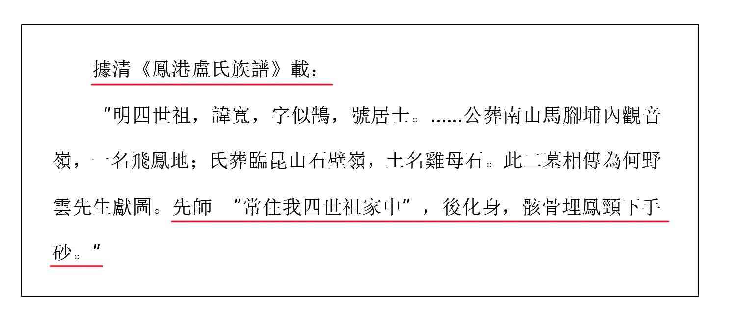 依据《凤港卢氏族谱》可知,卢宽公终于1394年,而何野云早一年仙逝于1393年(卢氏安葬何仙骸骨于凤港凤颈下手砂,即现在的何僊陵),而卢宽公墓是何野云先生献图而造,不是何仙亲做。由此可见,这个记载是实事求是的,符合常理。