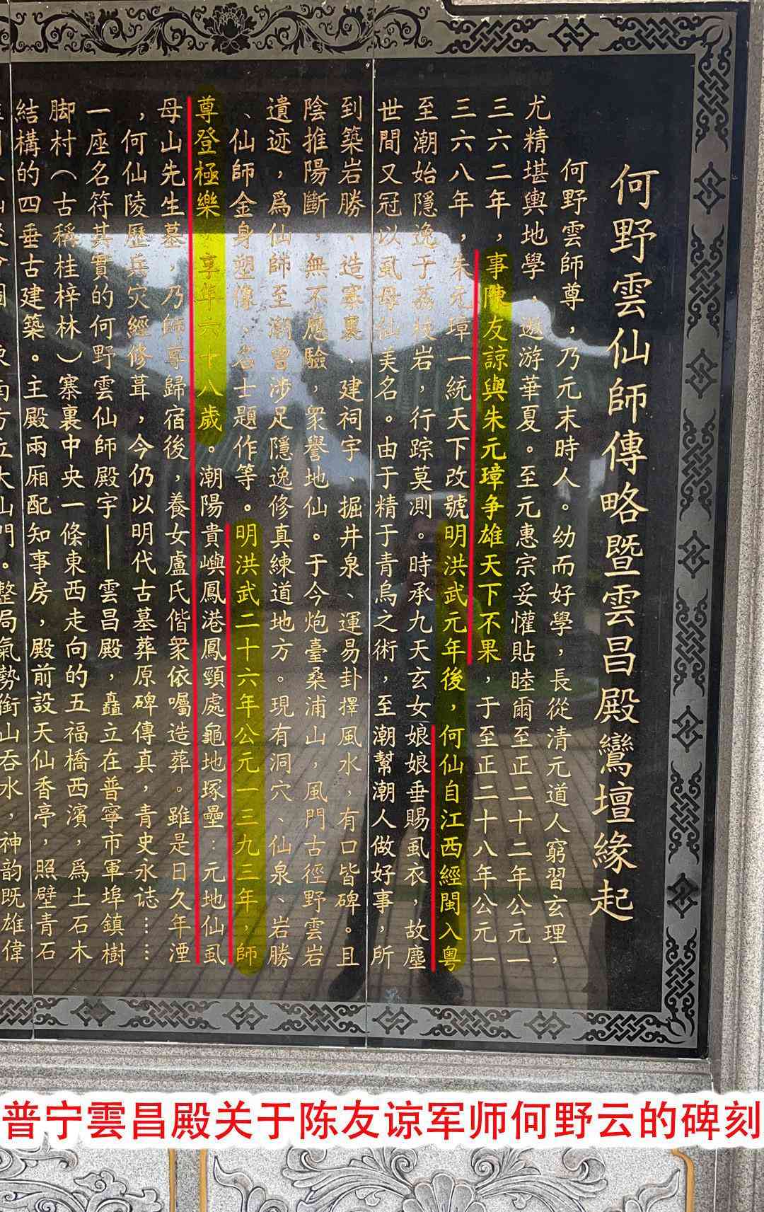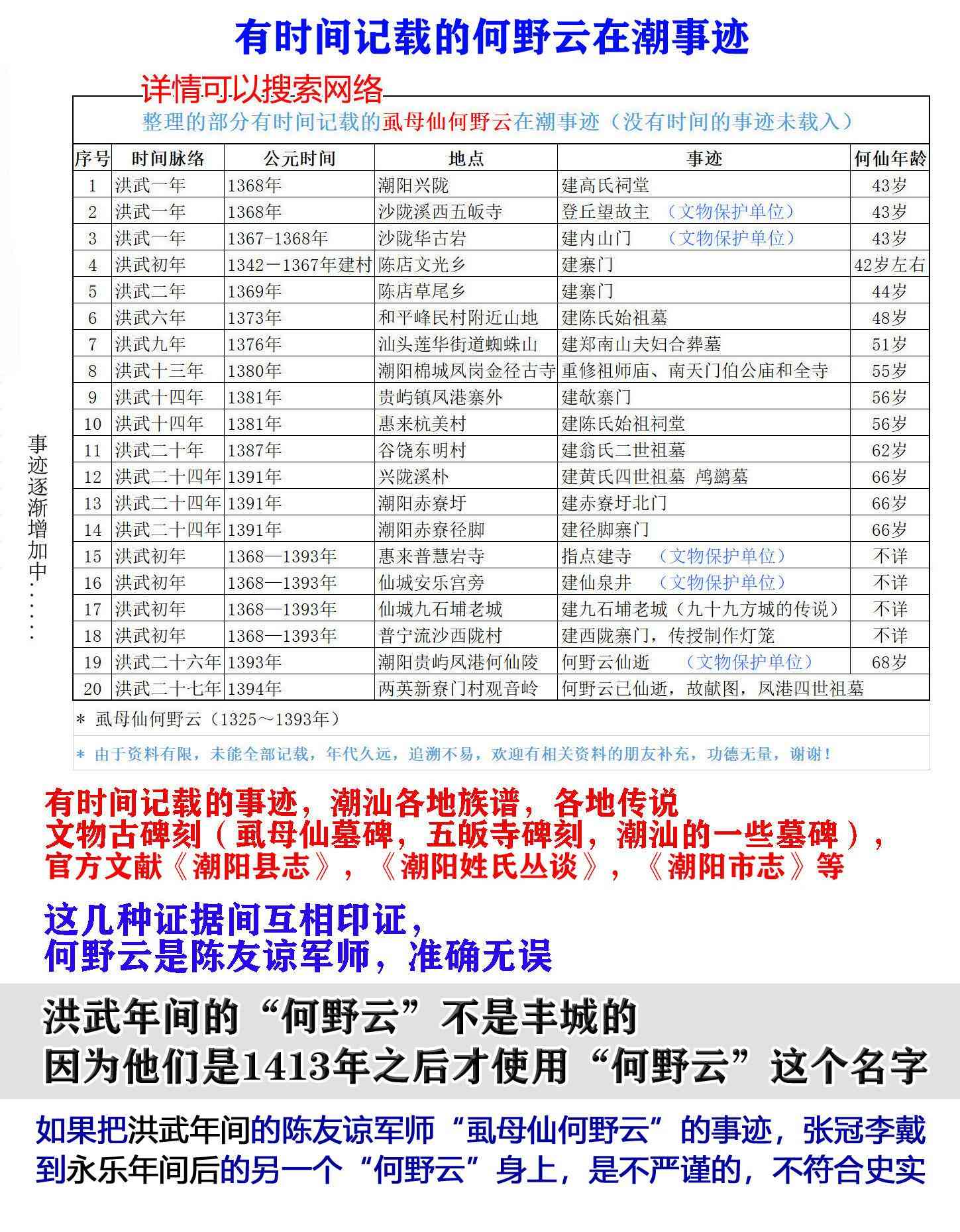种种这些事迹,从时间上证明,明朝刚建立的时候,1368年,虱母仙已经在潮汕了,这个证明自古以来传言的何野云是陈友谅军师从时间上来看是吻合的。