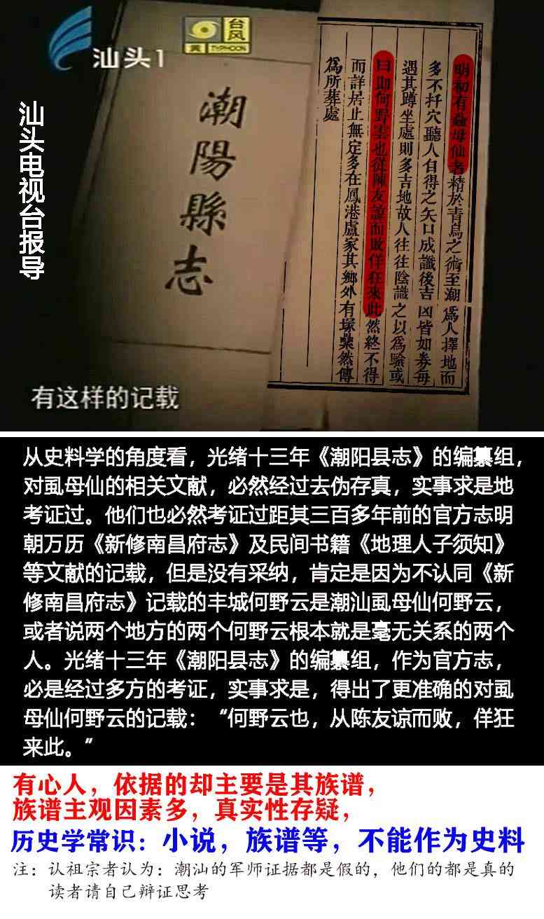 官方志书《潮汕县志》是直接记载虱母仙从陈友谅而败,佯狂来此,直接证明虱母仙的来历。而“有心人”例举的其他各种官方志,都没有能直接证明虱母仙来历的,他们仅仅凭的是牵强附会的推测和猜测,这是不严谨的,不可信的。可以肯定的是,不同的两个人,此何野云非彼何野云!