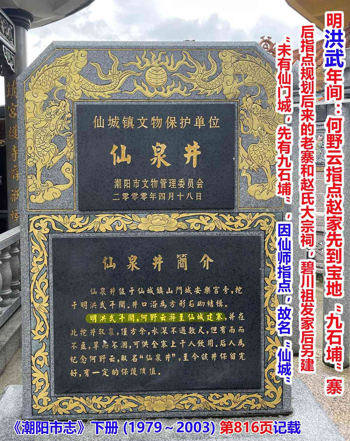 并指点规划后来的老寨和赵氏大宗祠,碧川祖发家后另建。所以仙城自古就有这个说法:“未有仙门城,先有九石埔”。因仙师指点,故名:仙门城,简称:仙城。
