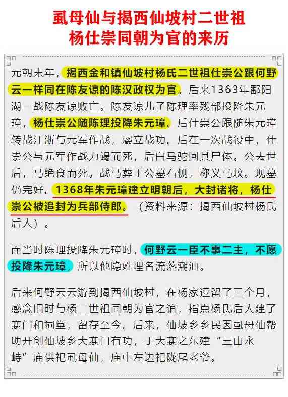 公元1360年,何野云事助陈友谅,揭西金和镇仙坡村杨氏二世祖仕崇公跟何野云一样同在陈友谅的陈汉政权为官。这就是何野云与杨仕崇公同朝为官的来历。后来1363年鄱阳湖一战陈友谅败亡。陈友谅儿子陈理率残部投降朱元璋,杨仕崇公随陈理投降朱元璋。后仕崇公跟随朱元璋转战江浙与元军作战,屡立战功。后在一次战役中,仕崇公与元军作战力竭而死,后白马驼回其尸体。公去世后,马绝食而死。战马葬于公墓右侧,称义马坟。现墓仍完好。1368年朱元璋建立明朝后,大封诸将,杨仕崇公被追封为兵部侍郎。(资料来源:揭西仙坡村杨氏后人)。