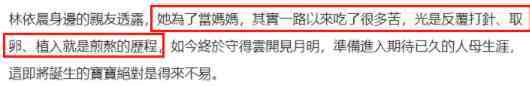 据知情人士透露,林依晨忍受过反复打针、取卵、植入等人工受孕过程。